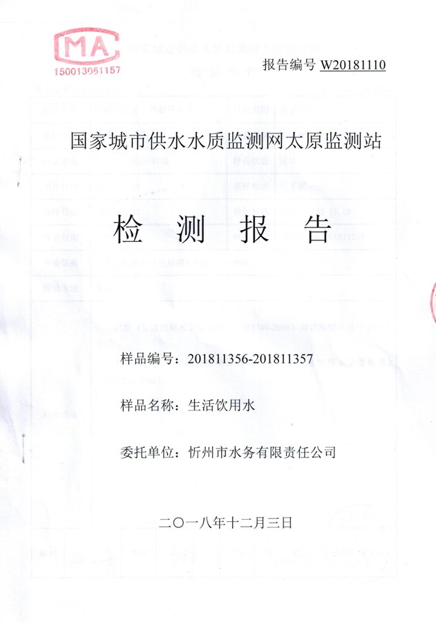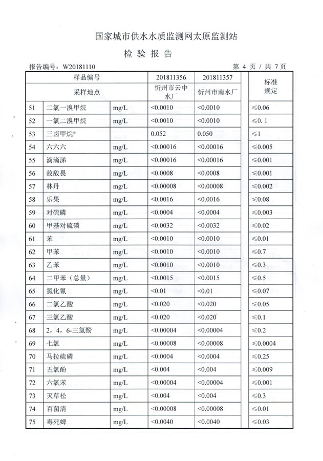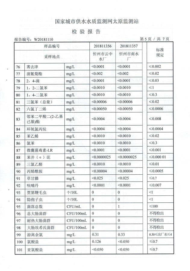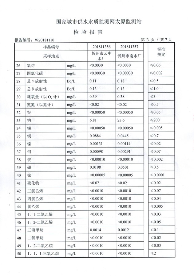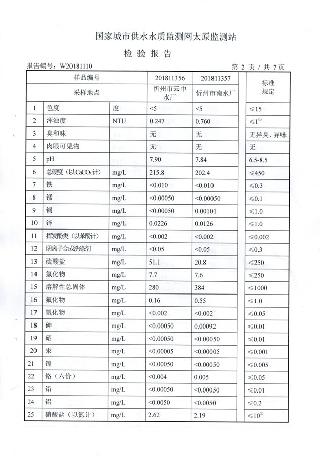 2018年忻州城區(qū)公共供水南水廠、云中水廠出廠水106項水質全分析信息公示