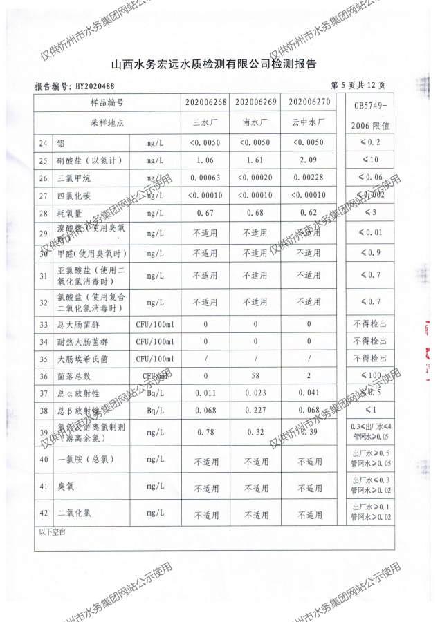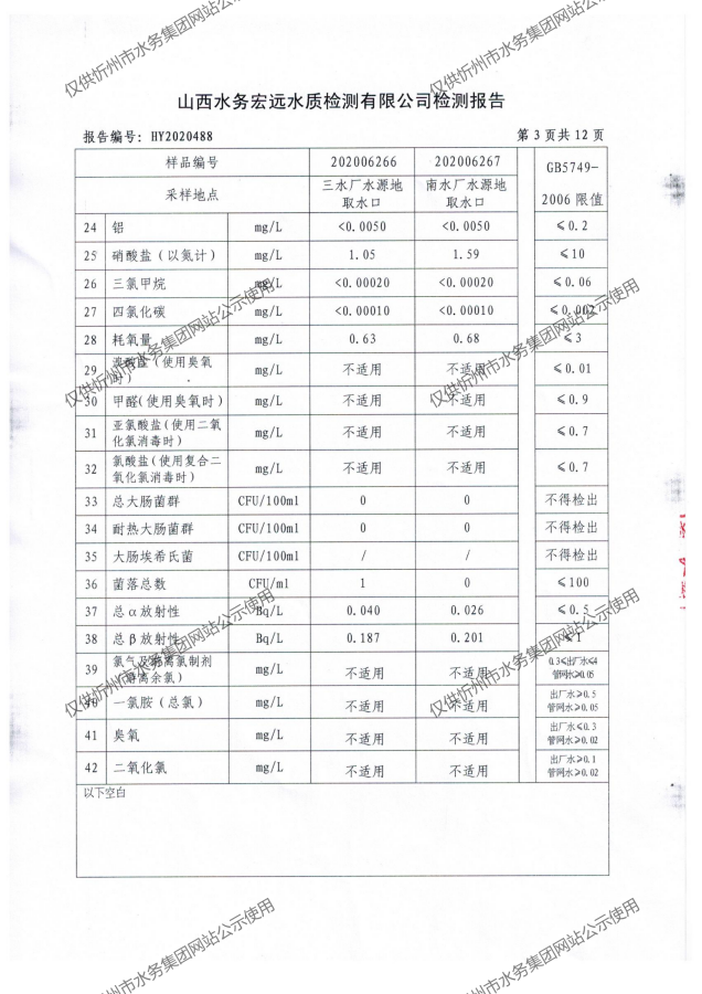 忻州城區(qū)公共供水水源水、出廠水、管網(wǎng)水、管網(wǎng)末梢水2020年7月份水質信息公示