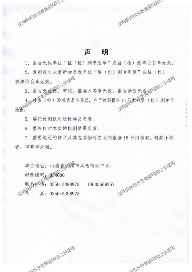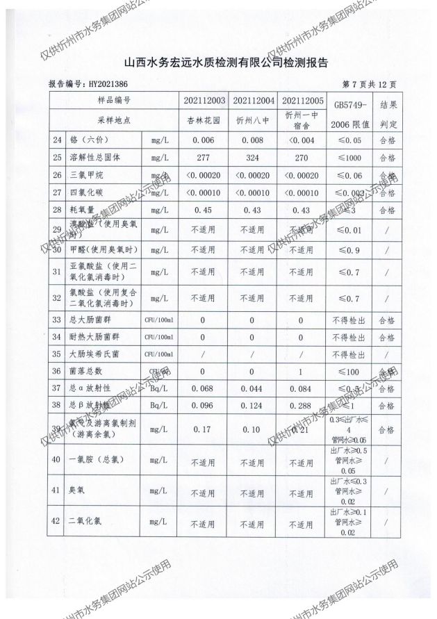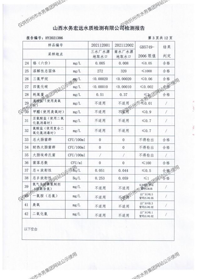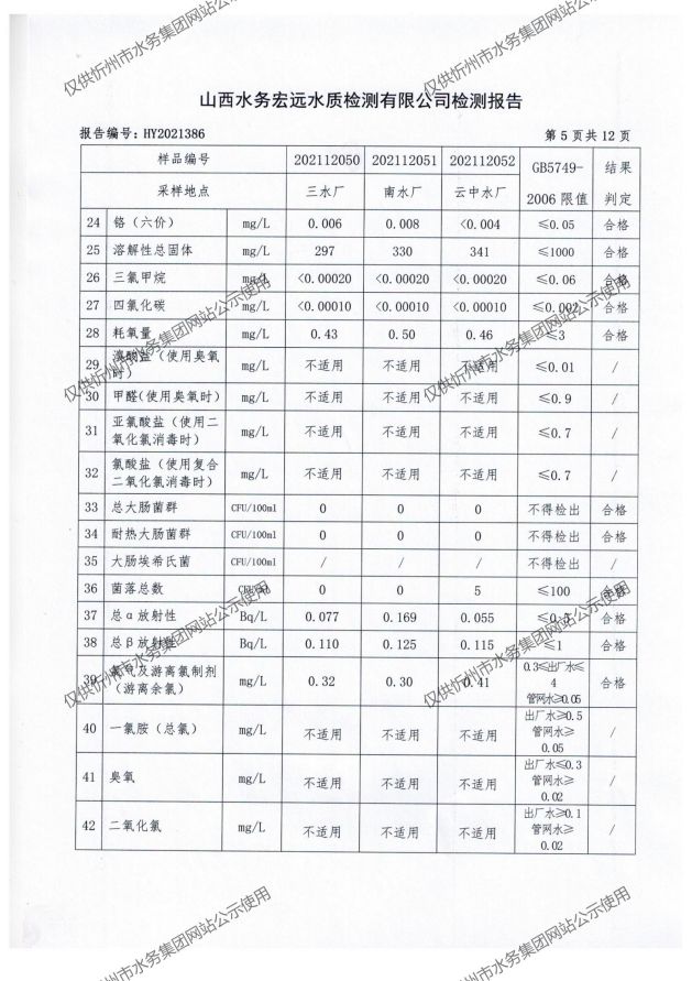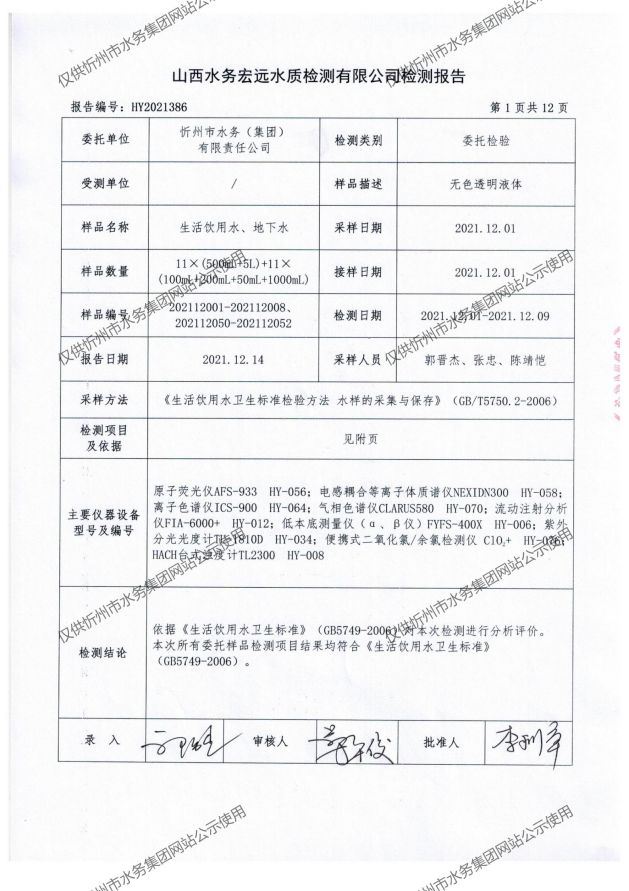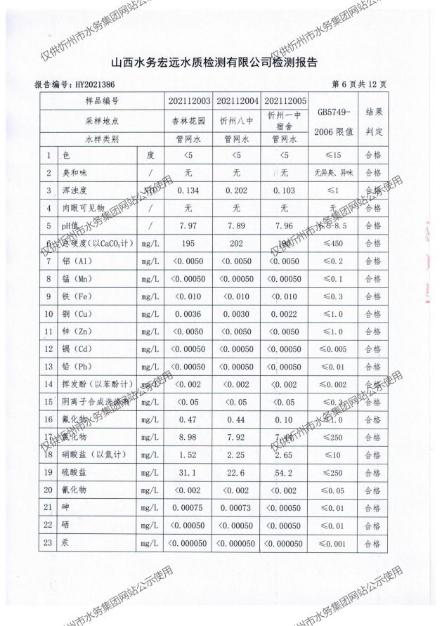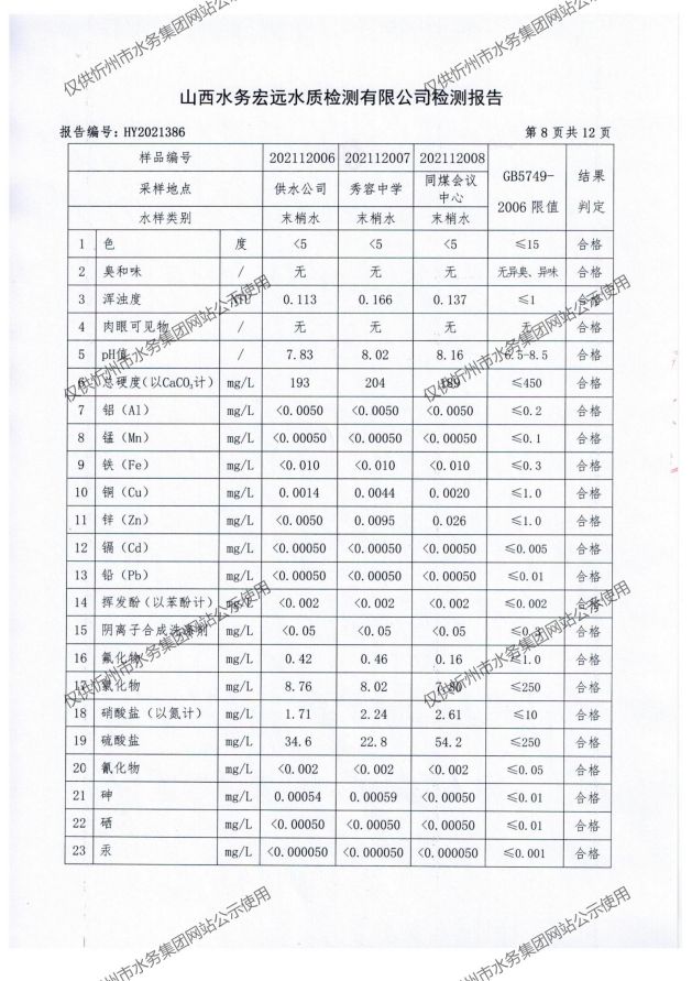 忻州城區(qū)公共供水水源水、出廠水、管網(wǎng)水、管網(wǎng)末梢水2021年12月份水質信息公示