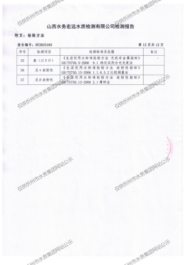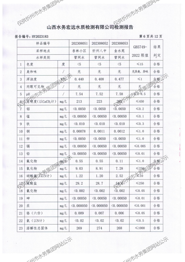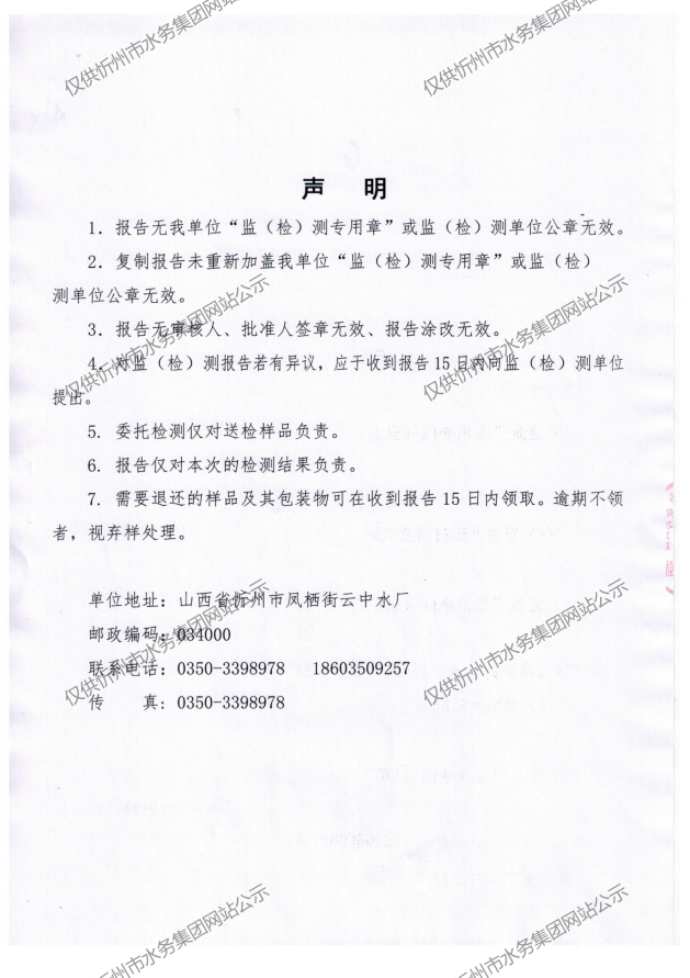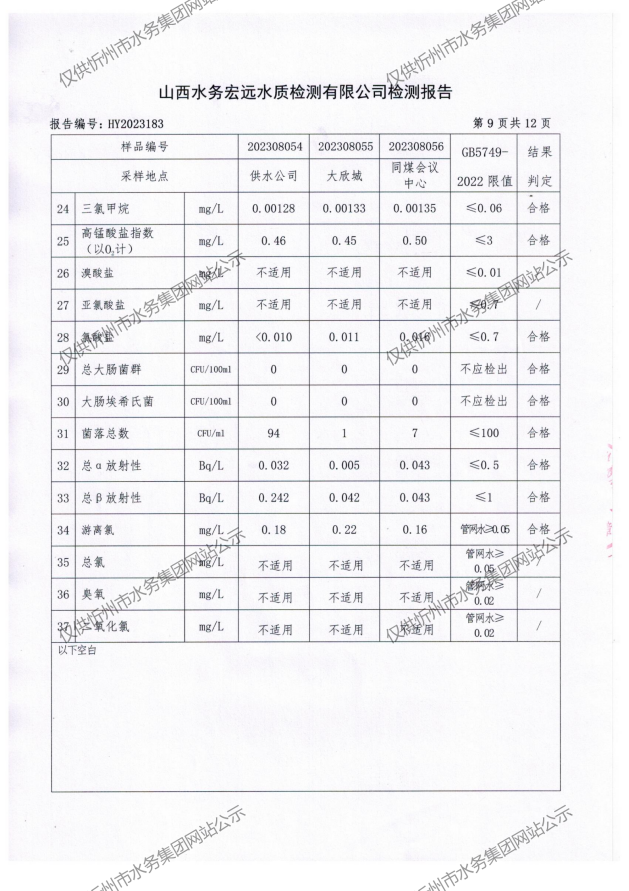 忻州城區(qū)公共供水水源水、出廠水、管網水、管網末梢水2023年8月份水質信息公示
